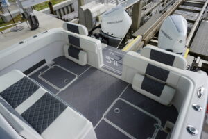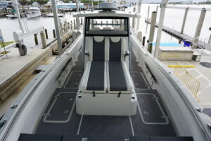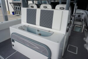 In addition to being the first 35IFC equipped with Honda’s, this was also the first 35IFC that we deleted the rear built-in cooler/seat and instead utilized a 110 qt cooler on a slide. This freed up a solid amount of cockpit space, but still allows for a cooler and a seat to be used when needed. We did sacrifice a bit of tackle storage on the sides of the leaning post, but it is a great option for folks who want to open up the cockpit a bit more!