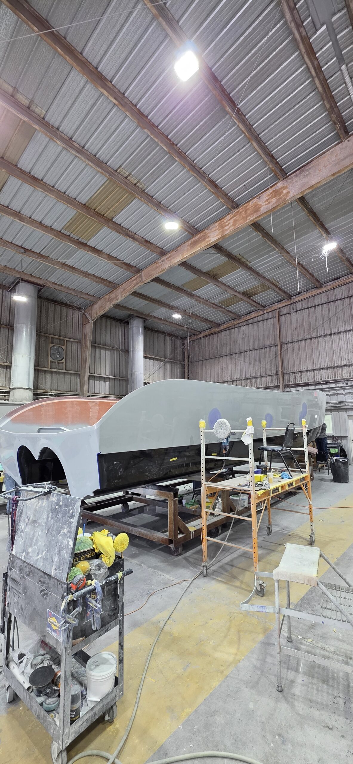 The coffin box is in final finishing, and the hardtop is complete and ready for rigging.
