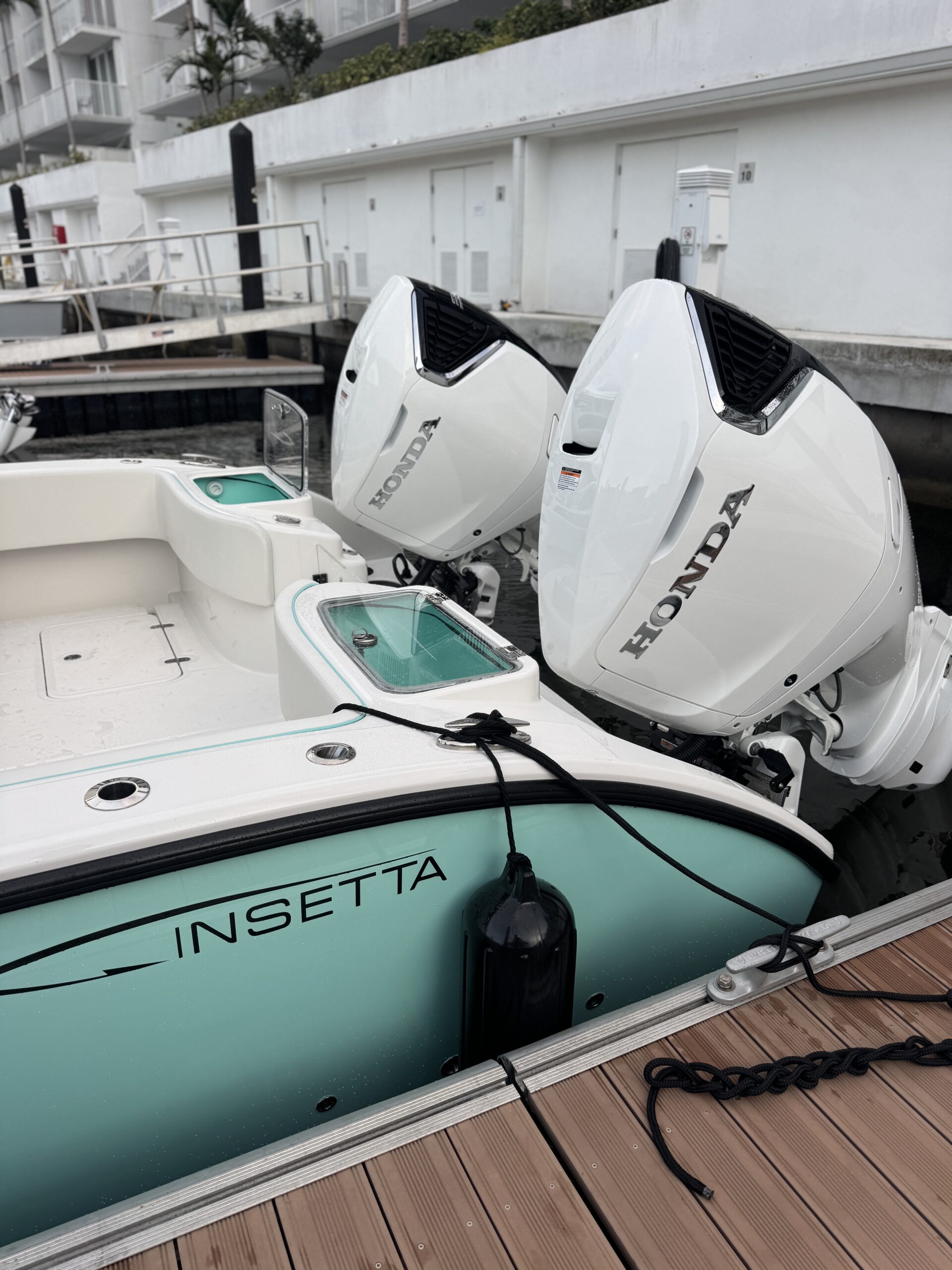 We’re stoked with how this build ended up – she’s equipped with dual 24″ Simrad MFD’s at the helm, open array radar, Rodan trolling motor, Optimus steering with joystick, JL audio sound system, Gemlux outriggers and components, Seafoam Green hull with black accents and white/tan/seafoam upholstery! We’re happy to have added two more options to our growing list of customizations for the Insetta 35IFC and look forward to the next two Honda 350 builds we have in the pipeline!